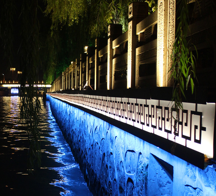 這條充滿歷史的河流也不該失色,廣東華電通過河道亮化體現(xiàn)揚(yáng)州古城的千年文明,以有創(chuàng)意的造型設(shè)計(jì),將揚(yáng)州園林文化及窗欞經(jīng)過藝術(shù)加工,融入河道照明設(shè)計(jì),改進(jìn)提升河道的照明功能系統(tǒng),燈具增加了排水、防垃圾積蓄功能,并且電線隱藏在燈具里,安裝好的燈就是一個(gè)裝飾品,不會(huì)看到燈體,河道的觀賞性更強(qiáng),后期維護(hù)也更便利。