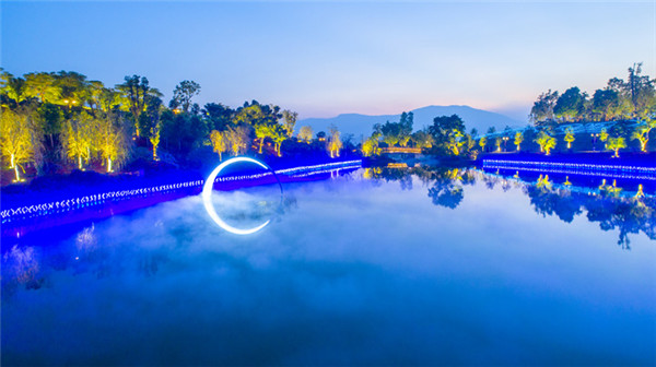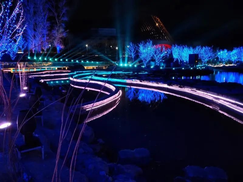 夜幕降臨,媯水河畔在燈光映襯下如夢如幻,令人嘆為觀止!有限的園景內(nèi),借景構(gòu)景,巧妙融合山林、湖水、草木,將人與自然、文化與科技、中國與世界凝聚于湖光山色的自然意趣之間。
