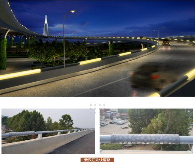 這款燈主材為導(dǎo)光板,形狀設(shè)計(jì)成圓柱狀,表面融入武漢本地文化楚圖騰圖案,護(hù)欄燈白天可作為裝飾,晚上可起到照明裝飾的作用,具有一燈兩用的效果。通過(guò)抱箍的方式安裝到方形護(hù)欄上,大大節(jié)省安裝時(shí)間和成本,安裝過(guò)程中配合防震防滑材料的使用,即便大車(chē)引起的振動(dòng)也不會(huì)導(dǎo)致護(hù)欄燈發(fā)生移動(dòng)。夜晚燈光亮起,一個(gè)個(gè)護(hù)欄燈呈現(xiàn)出光效飽滿(mǎn)無(wú)光污染,柔和不眩光的光彩,整體變色,在車(chē)行方向右側(cè)排布,起到指引向前的效果,避免了過(guò)強(qiáng)光對(duì)視力的干擾,讓司機(jī)能更專(zhuān)注于行車(chē)。