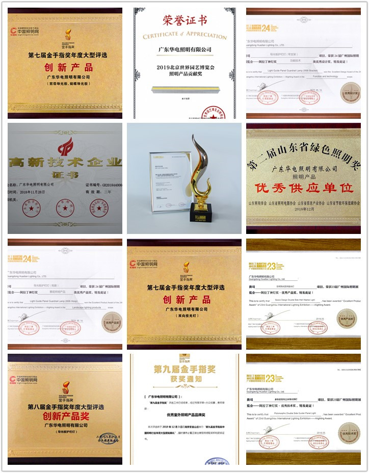 廣東華電照明有限公司成立于2003年---國家級高新技術企業,一直秉承“品質為先、創意無限”理念。公司專注于LED燈具、控制系統等領域的技術研發及創新應用,獲得國家、國際專利近三百項,發明專利二十余項,同時獲得廣東省年度重大科技專項資金500萬元,廣東省科技進步獎、重大科技專項實施單位、民營科技企業、優秀專業發明獎、創新產品、生產供應優秀單位等多項榮譽。
