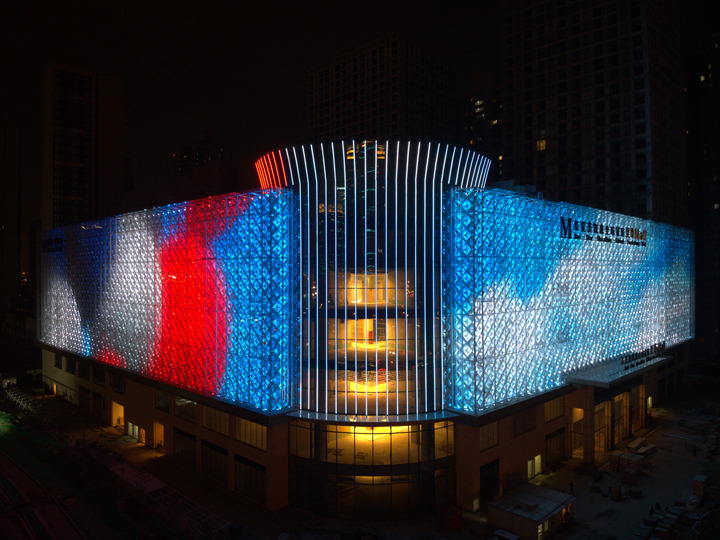 項目簡介:紅星美凱龍至尊Mall是由第九代藝術大師傾力打造的商貿藝術綜合體,建筑形態一弧四面成整體,超越層的概念,簡繁相宜。我司研發團隊依托建筑獨特的外形設計及藝術化幕墻結構,將建筑打造為華美典雅、夢幻多姿的夜幕形象,實現了不破壞外立面的藝術美感,達到見光不見燈的完美效果;通過技術這只巧手,將無形的光遵循設計師的設想去完成藝術的創作,令立面花栩栩如生,花瓣盛開的四個方向配合內部的背板,呈現出有層次、有細節的品質之光,完美地實現了潔白的花朵在夜晚盛開的場景。