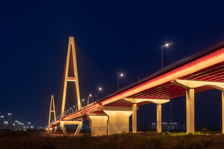 項目簡介:該項目為世界首座主纜連續的三塔四跨懸索橋,以及世界同類橋梁中跨度最大的三塔四跨懸索橋。我司采用投光燈將最突出的標志物主塔打亮。無數根排列整齊的拉索由我司的投光燈06款由下至上被打亮。橋腹以及橋墩根據需求使用不同功率的投光燈和洗墻燈,夜晚,橋梁在燈光的襯托下綻放美麗的身影,仿佛一架碩大無比的豎琴迎風彈奏,使宏偉的鸚鵡洲長江大橋顯得更加絢麗多姿。