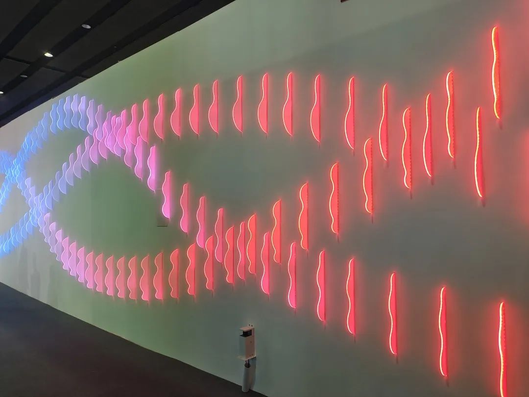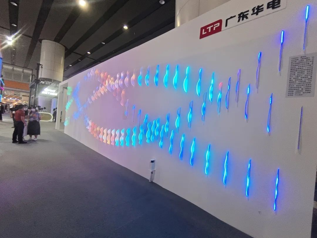 廣東華電自2003年成立以來,一直專注LED光電、燈具、控制系統等領域的技術研發及應用創新,是一家集研發、生產、銷售服務為一體的國家級高新技術企業。華電導光板憑借著無污染、發熱量低,色彩表現豐富,發光均勻、發光面積大、可隱形化、異形化定制、高透亮,安裝簡單、重量輕、裝飾性強、可與建筑緊密貼合、可塑性強、可應用DMX512或SPI信號控制等優點入選了作品《無限可能》首選產品,融入最新的智能互動控制,光影跟蹤,增強互動體驗,時而如“波光律影”時而如“行云流水”,讓客戶頗為驚嘆。