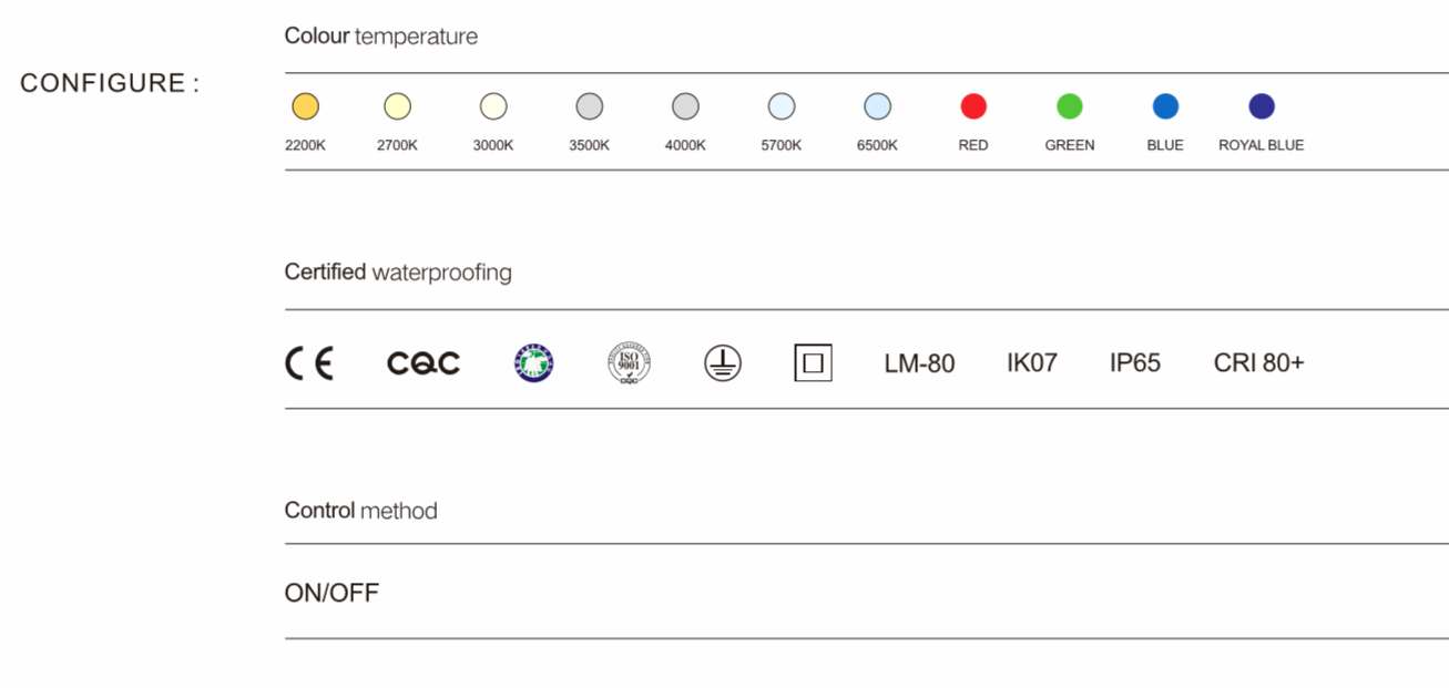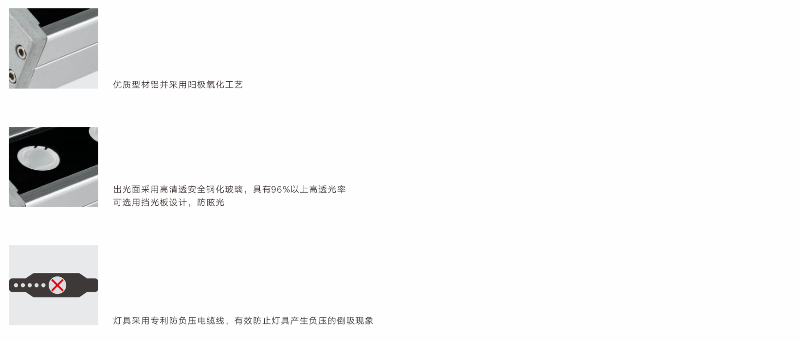 材質:燈體-優質型材鋁;支架-優質鋁合金沖壓成型;端蓋-優質壓鑄鋁材;出光面-高清透安全鋼化玻璃;螺絲一不銹 鋼;電纜特殊工藝防負壓、防倒吸電纜線,單端外留150mm;二次光學透鏡-PMMA