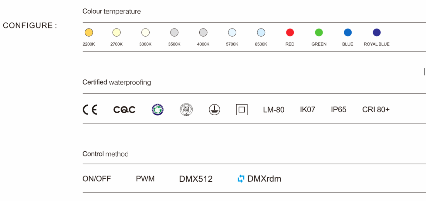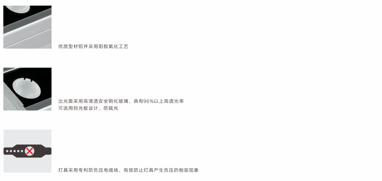 材質:燈體-優質型材鋁;支架-優質鋁合金沖壓成型;端蓋-優質壓鑄鋁材;出光面-高清透安全鋼化玻璃;螺絲-不銹 鋼;電纜一特殊工藝防負壓、防倒吸電纜線,單端外留150mm;二次光學透鏡-PMMA