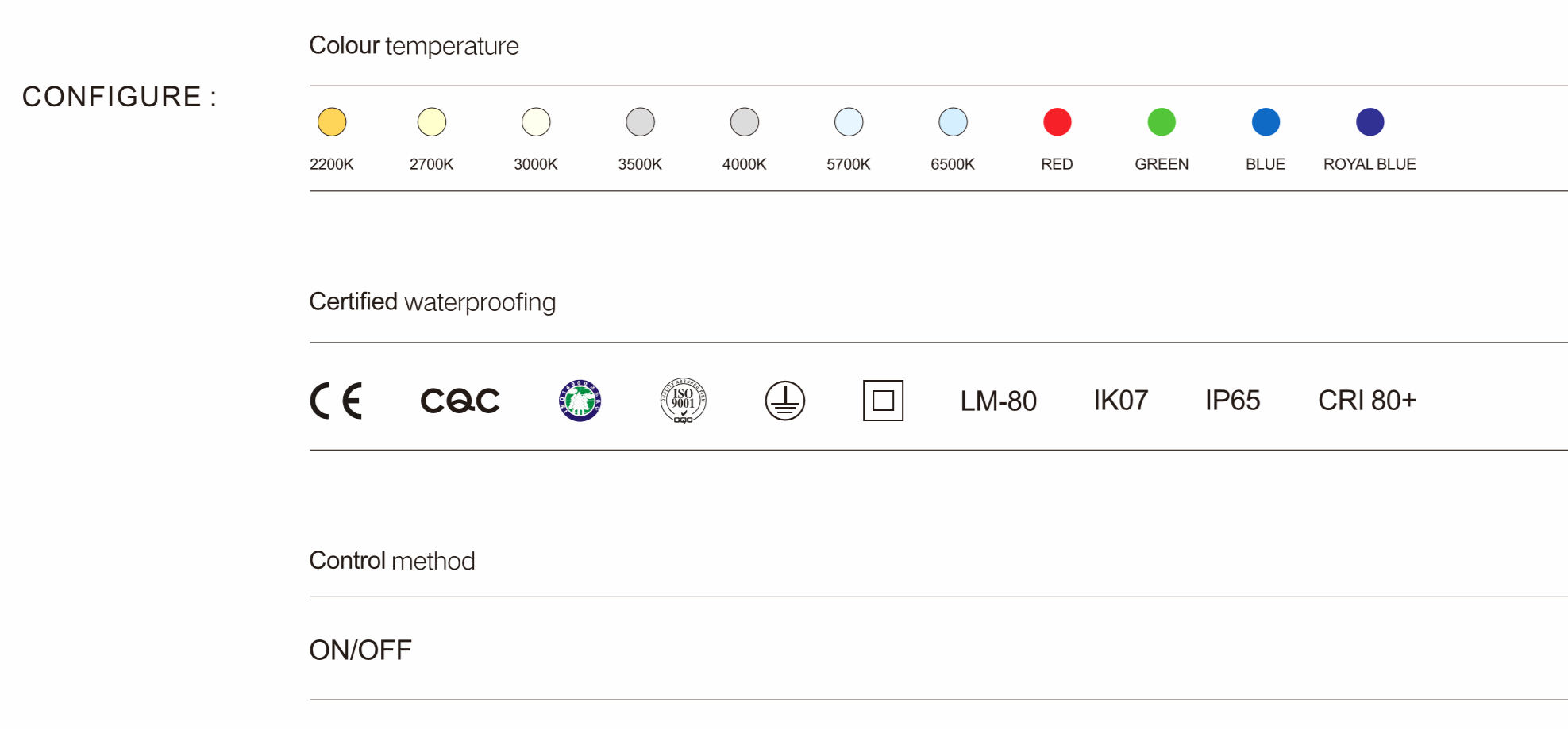 材質(zhì):燈體、安裝支架-優(yōu)質(zhì)鋁合金;出光面-高清透安全鋼化玻璃;螺絲一不銹鋼;電纜一特殊工藝防負(fù)壓、防倒吸電纜 線,單端外留350mm;二次光學(xué)透鏡-PMMA