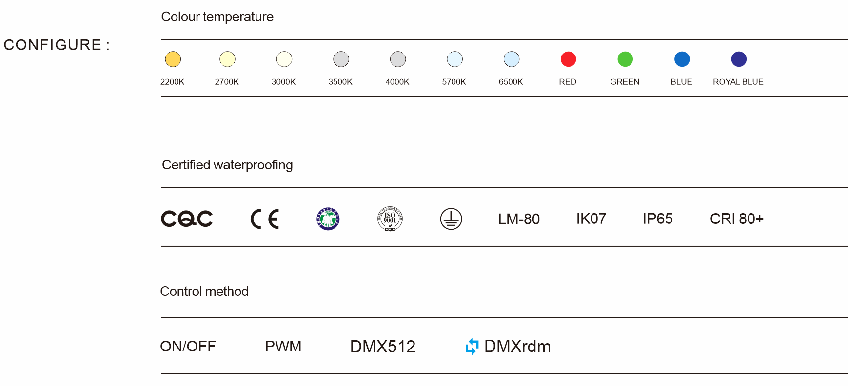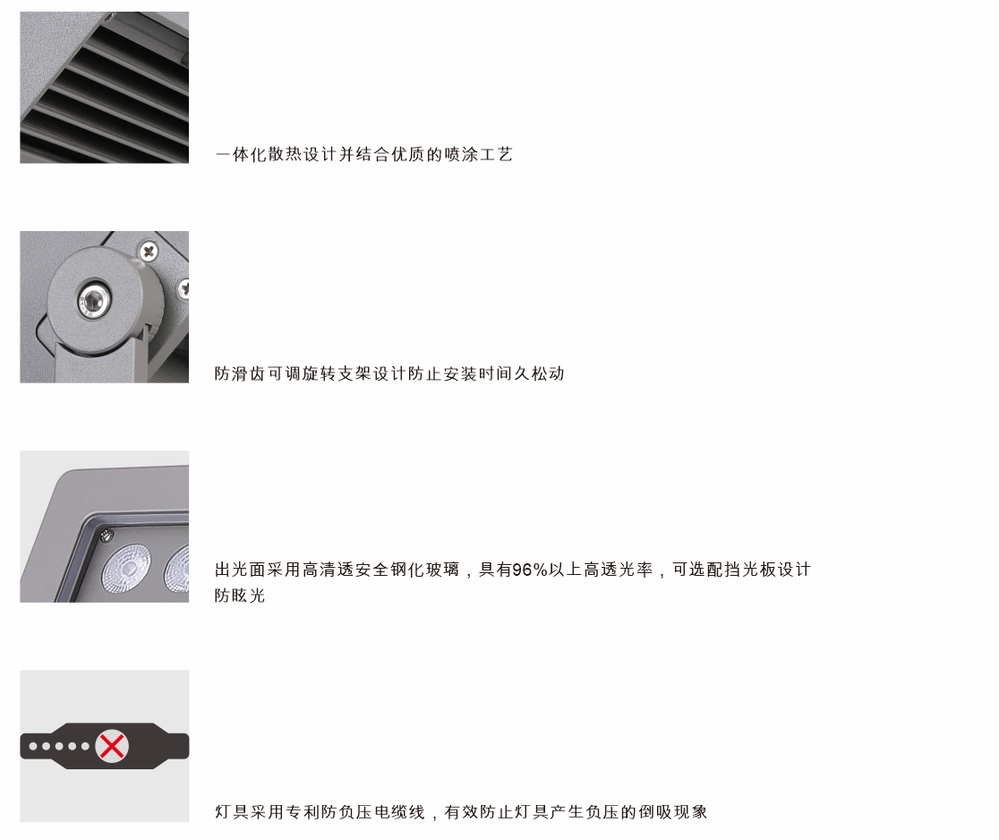 材質:燈體、安裝支架一優質鋁合金;出光面-高清透安全鋼化玻璃,具有96%以上高透光率;螺絲一不銹鋼;電纜一特殊 工藝防負壓、防倒吸電纜線;單端外留350mm;二次光學透鏡-PMMA