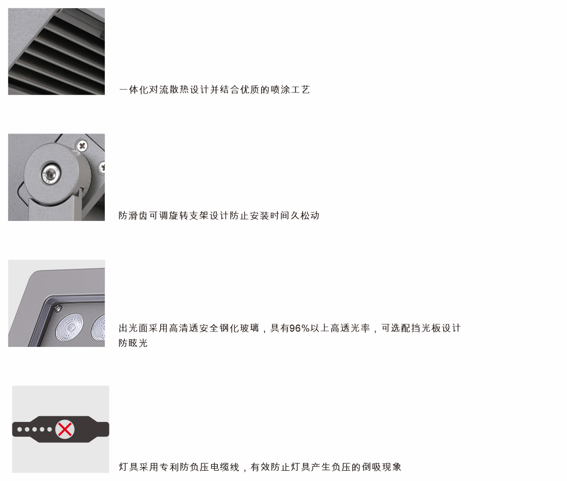 材質:燈體、安裝支架一優質鋁合金;出光面-高清透安全鋼化玻璃,具有96%以上高透光率;螺絲一不銹鋼;電纜一特殊 工藝防負壓、防倒吸電纜線;單端外留350mm;二次光學透鏡-PMMA