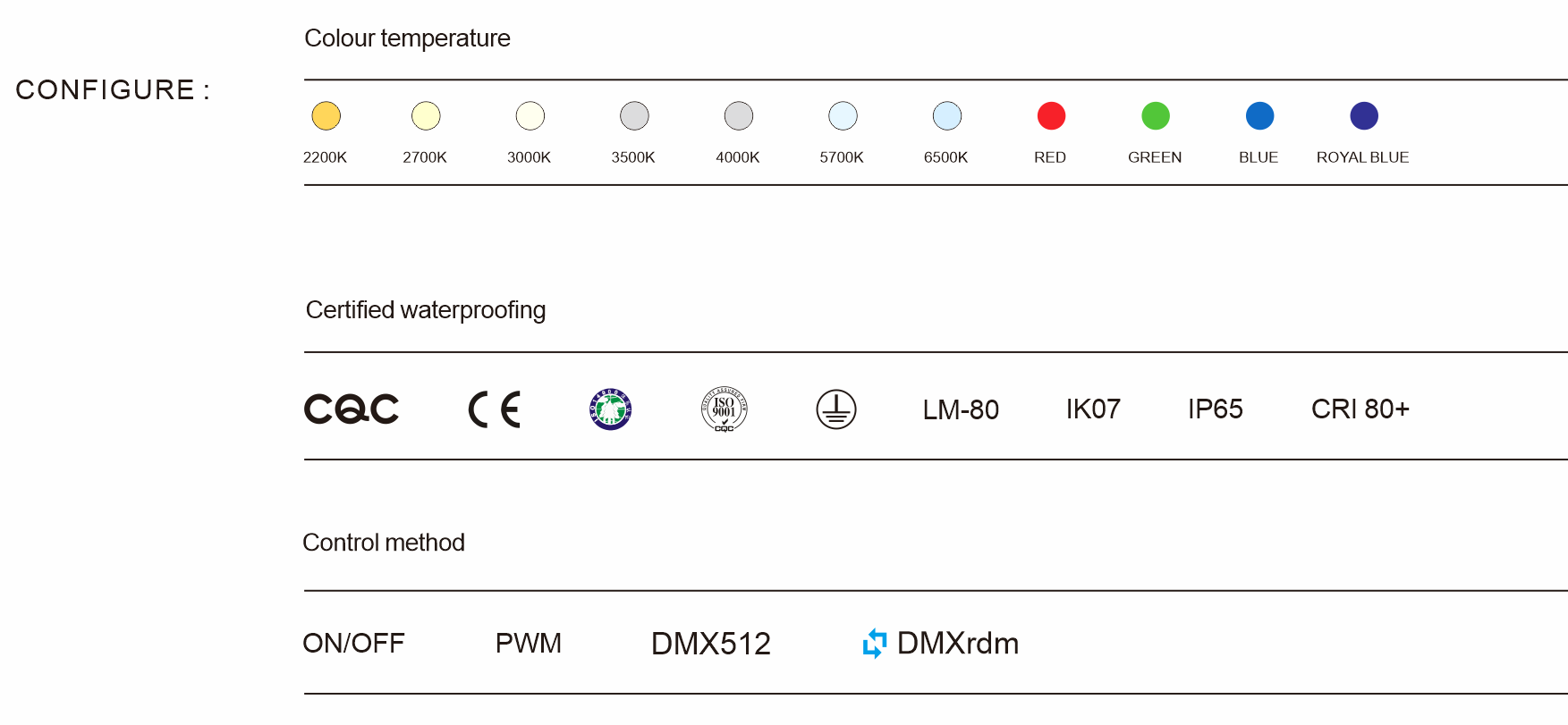 材質:燈體、安裝支架一優質鋁合金;出光面-高清透安全鋼化玻璃,具有96%以上高透光率;螺絲一不銹鋼;電纜一特殊 工藝防負壓、防倒吸電纜線;單端外留350mm;二次光學透鏡-PMMA