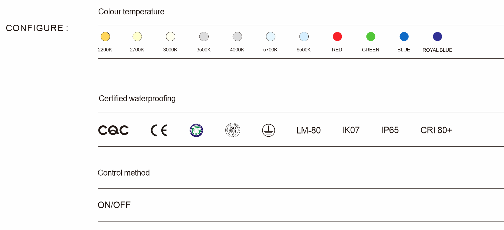 材質:燈體-優質型材鋁;安裝支架、端蓋-優質鋁合金;出光面-高清透安全鋼化玻璃;螺絲一不銹鋼;電纜-特殊工藝 防負壓電纜線,單端外留150mm