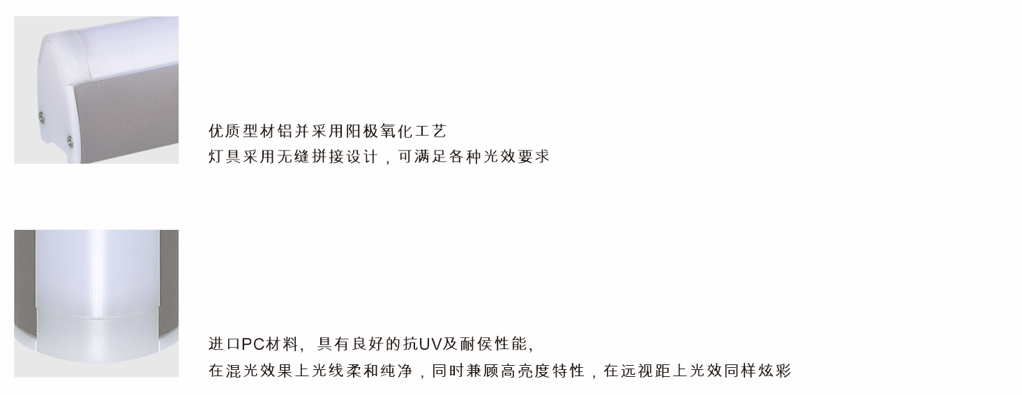 材質(zhì):燈體、安裝支架-優(yōu)質(zhì)型材鋁;端蓋一阻燃PC注塑成型:出光面一進(jìn)口PC原材料:螺絲一不銹鋼;電纜一特殊 工藝防負(fù)壓、防倒吸電纜線;單端外留150mm