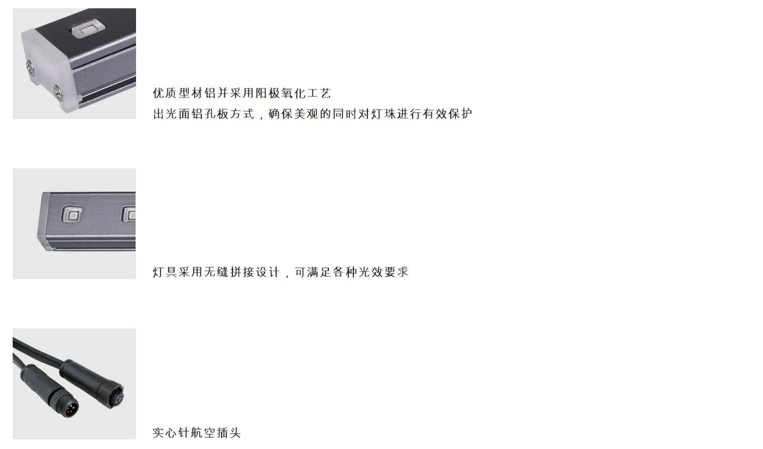 材質:燈體-優質型材鋁;安裝支架-不銹鋼;出光面-采用鋁孔板方式;電纜一特殊工藝防負壓、防倒吸電纜線,單端 外留150mm
