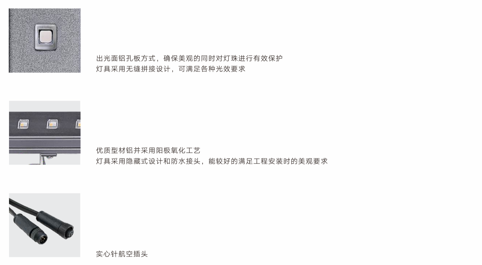 材質:燈體-優質型材鋁;安裝支架-不銹鋼:出光面-采用鋁孔板方式;電纜一特殊工藝防負壓、防倒吸電纜線,單端 外留150mm