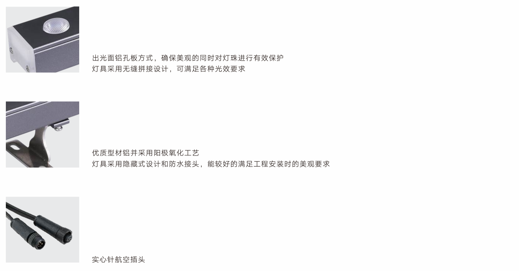 材質:燈體-優質型材鋁;安裝支架-不銹鋼;出光面-采用鋁孔板方式;電纜一特殊工藝防負壓、防倒吸電纜線,單端 外留150mm