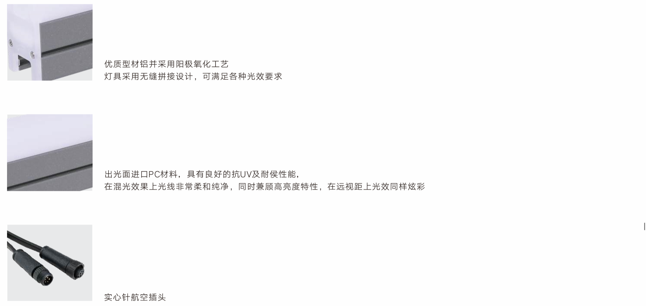 材質:燈體-優質型材鋁;安裝支架-不銹鋼;端蓋一阻燃PC注塑成型;出光面一進口PC原材料;螺絲一不銹鋼;電纜 一特殊工藝防負壓、防倒吸電纜線,單端外留150mm