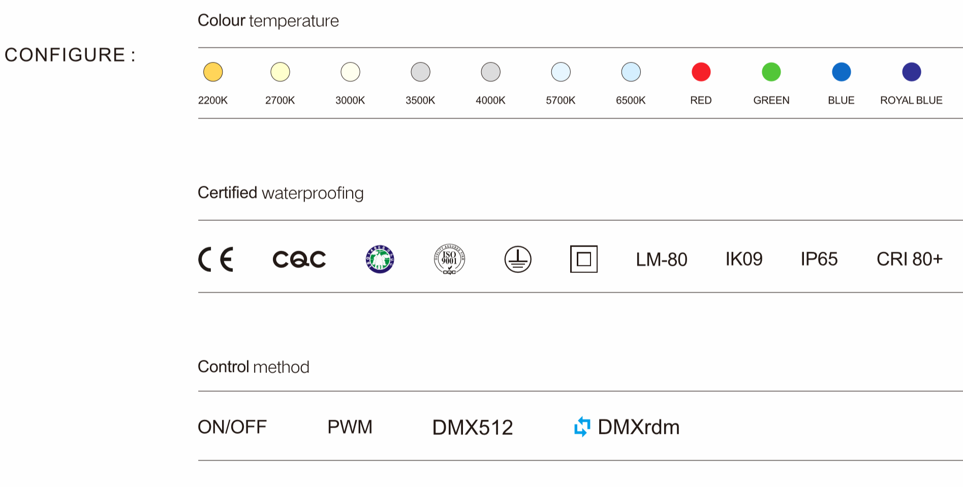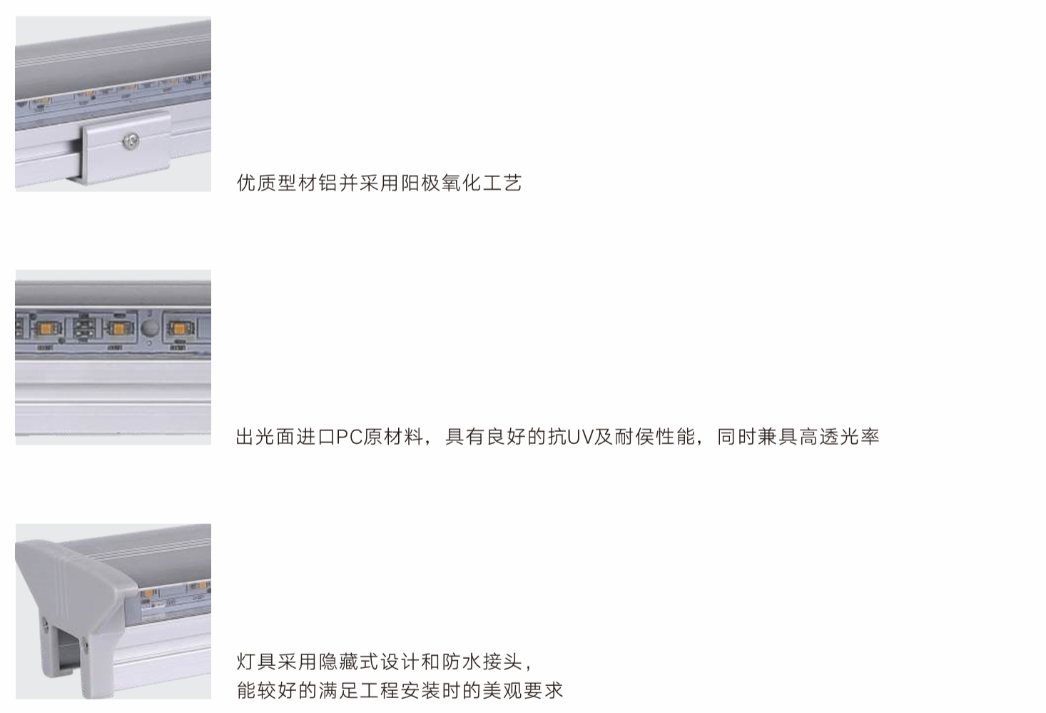 材質:燈體、安裝支架-優質型材鋁;端蓋、出光面-抗UV阻燃PC材質;電纜一特殊工藝防負壓、防倒吸電纜線,常規 外留150mm