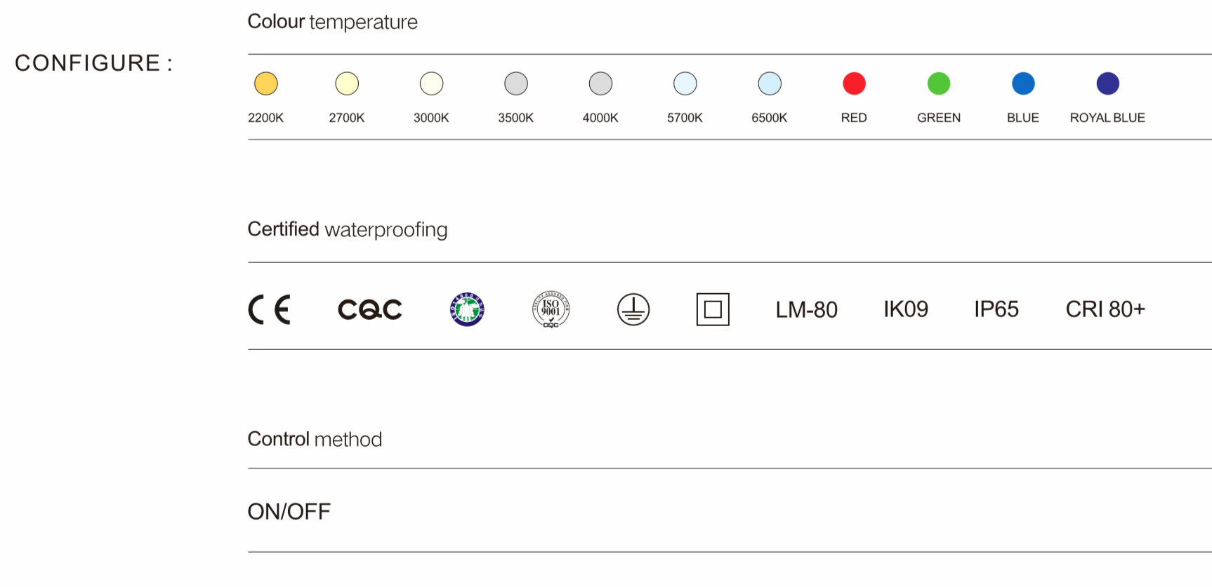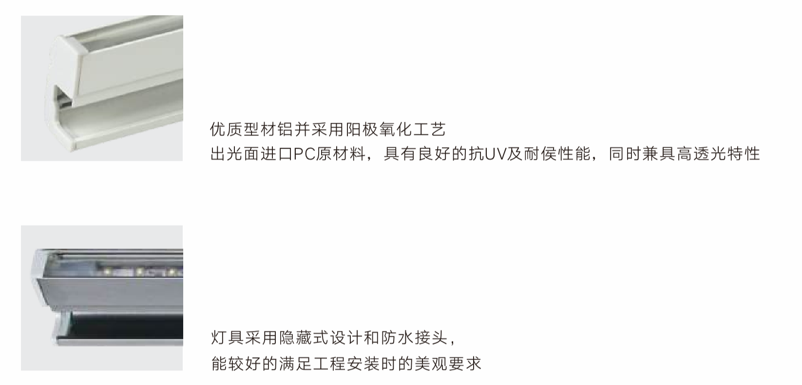 材質:燈體、安裝支架-優質型材鋁;端蓋、出光面-抗UV阻燃PC材質;電纜一特殊工藝防負壓、防倒吸電纜線,常規 外留150mm