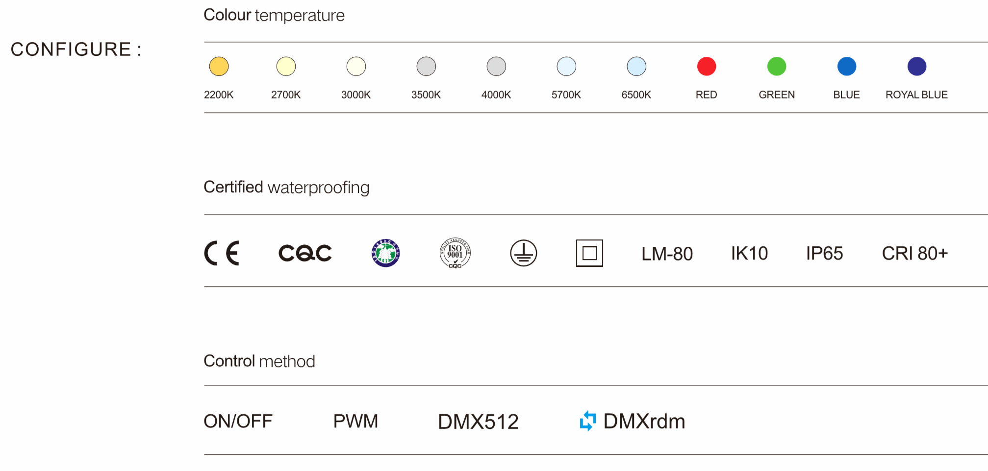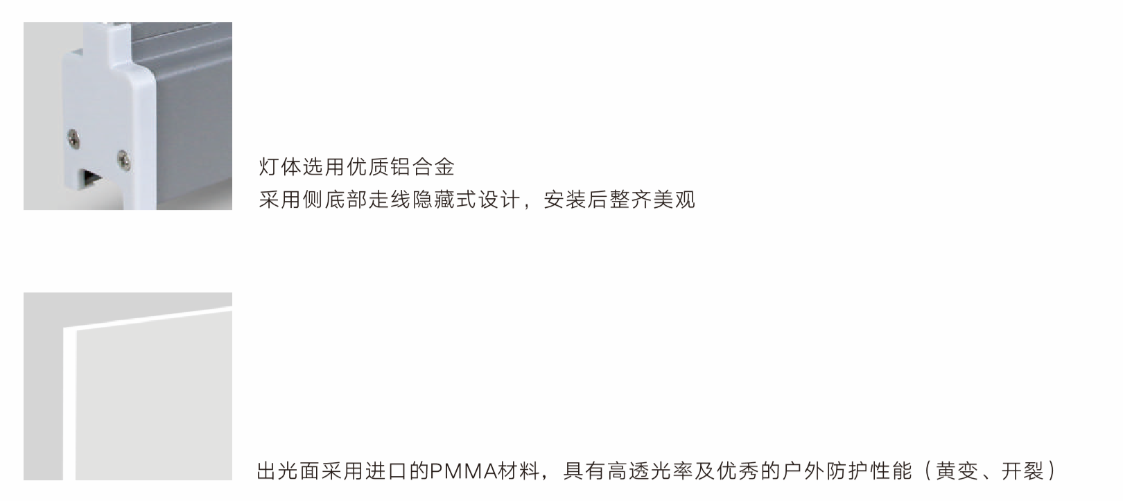 材質:燈體、支架-優質型材鋁;出光面一抗UV PMMA材質;端蓋一阻燃PC注塑成型;螺絲一不銹鋼;電纜一特殊工藝防負 壓電纜線,單端外留300mm