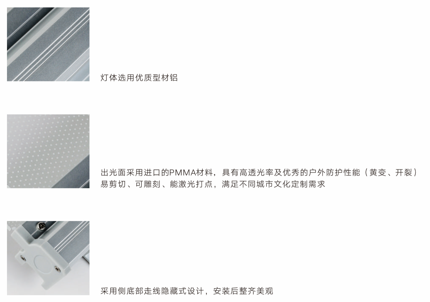 材質:燈體、支架-優質型材鋁;出光面一抗UV PMMA材質;端蓋一阻燃PC注塑成型;螺絲一不銹鋼;電纜一特殊工藝防負 壓電纜線,單端外留150mm