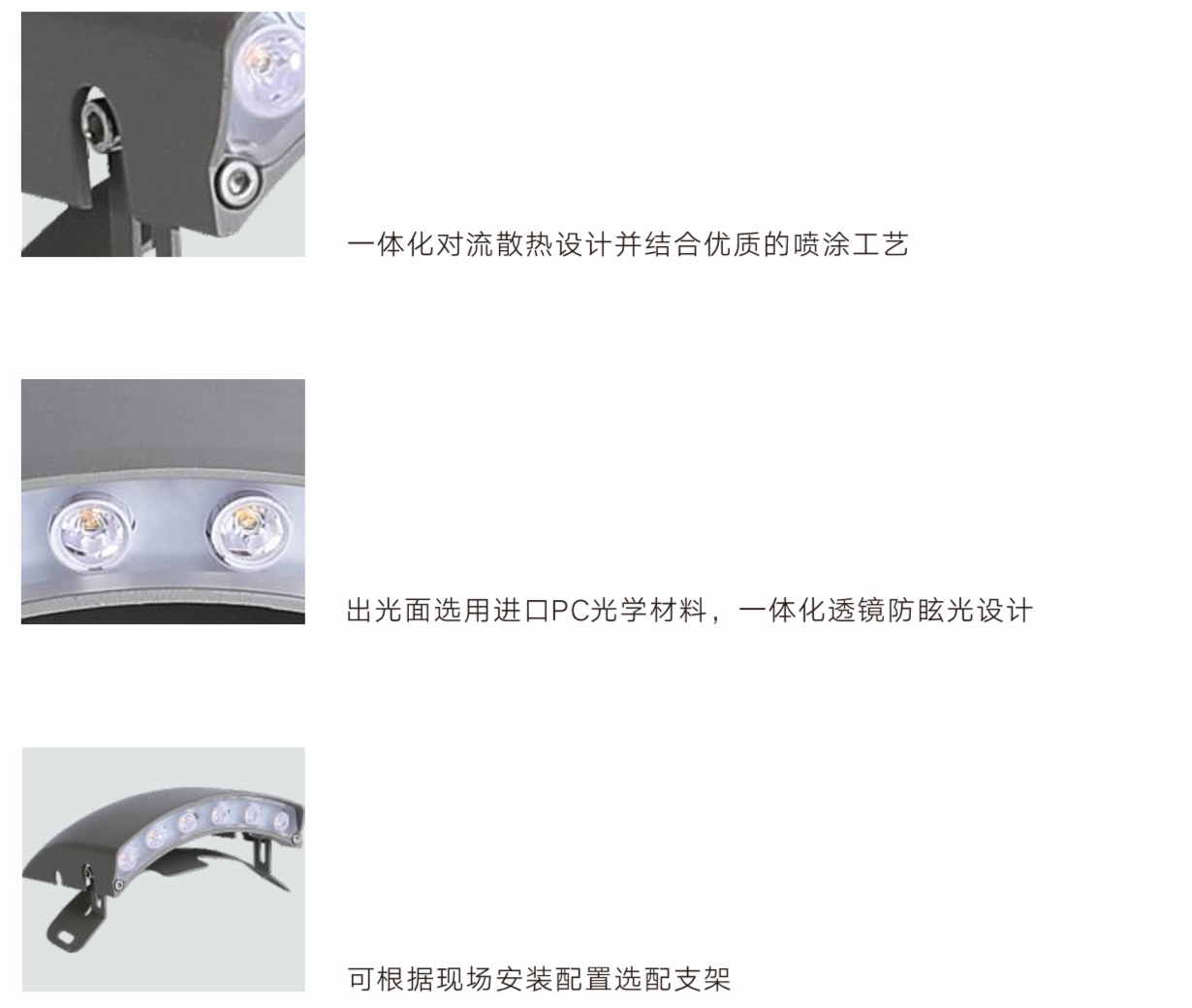 一體式散熱型燈具,適用環境溫度范圍-20℃~55℃, IP65,電氣安全等級III類。