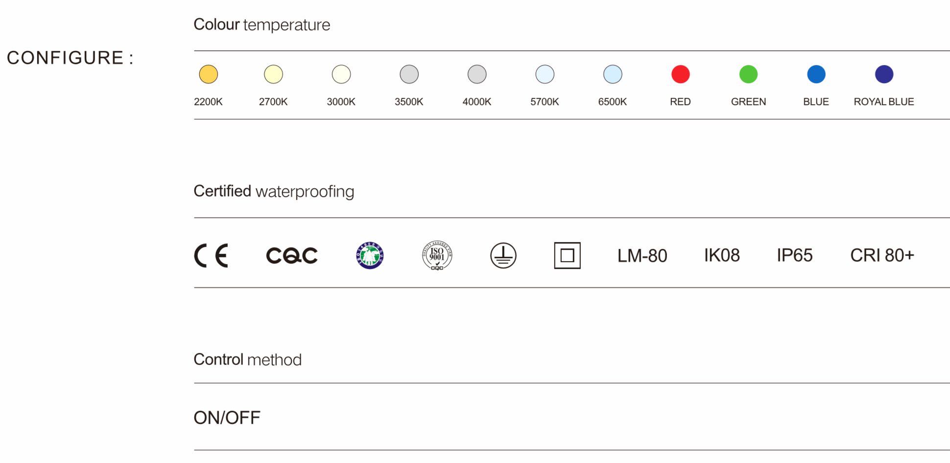 材質:燈體、支架-優質鋁合金;出光面一抗UV PC材質;螺絲一不銹鋼;電纜一特殊工藝防負壓、防倒吸電纜線,單端外留 150mm;二次光學透鏡-PMMA