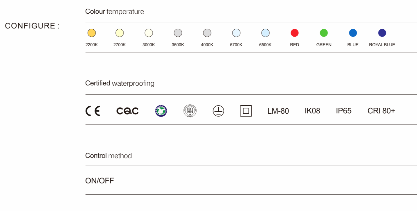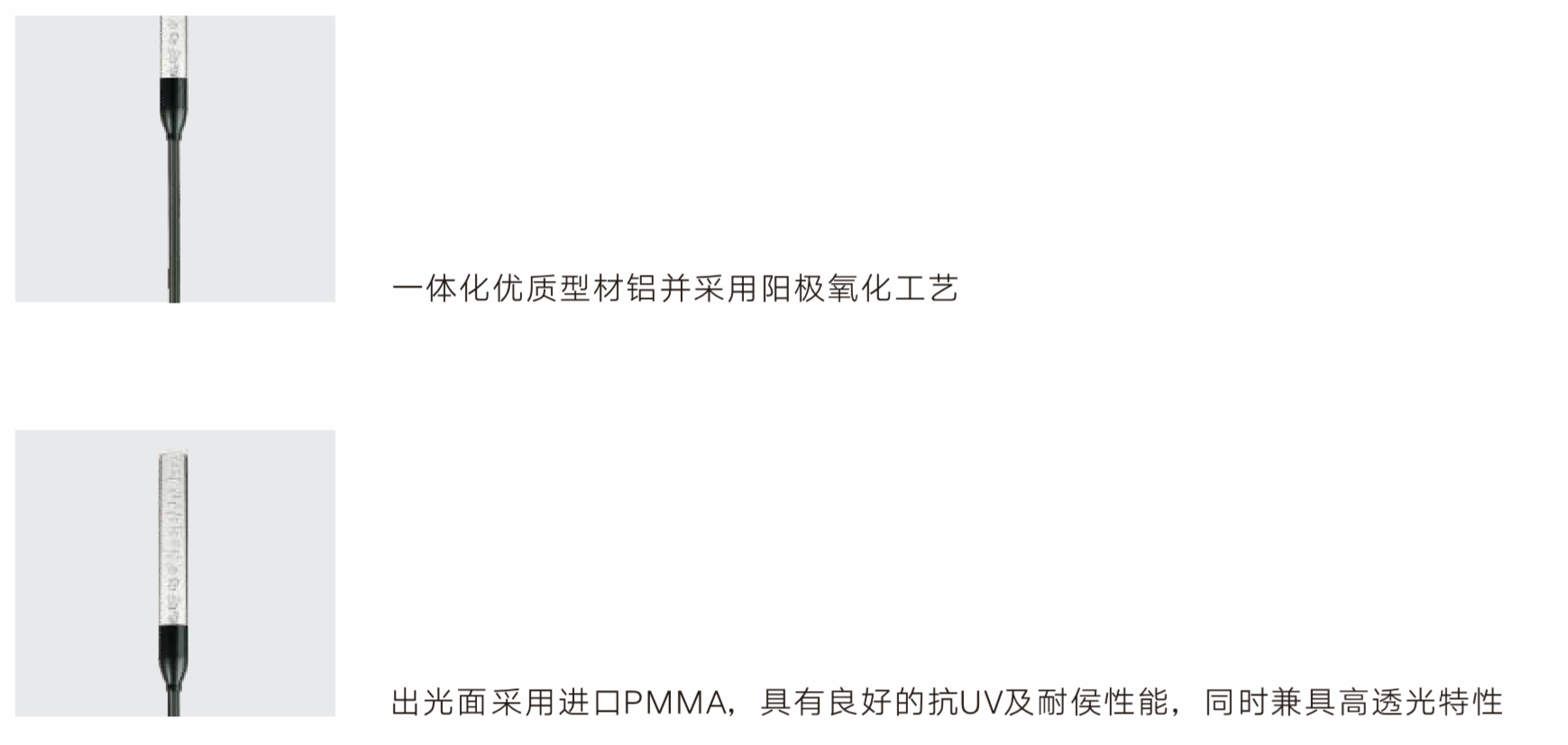 材質:燈體一優質鋁合金;出光面一抗UV圓柱形PMMA;燈桿一不銹鋼;電纜一特殊工藝負壓電纜線,單端外留350mm